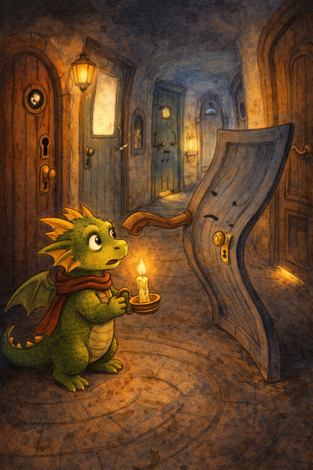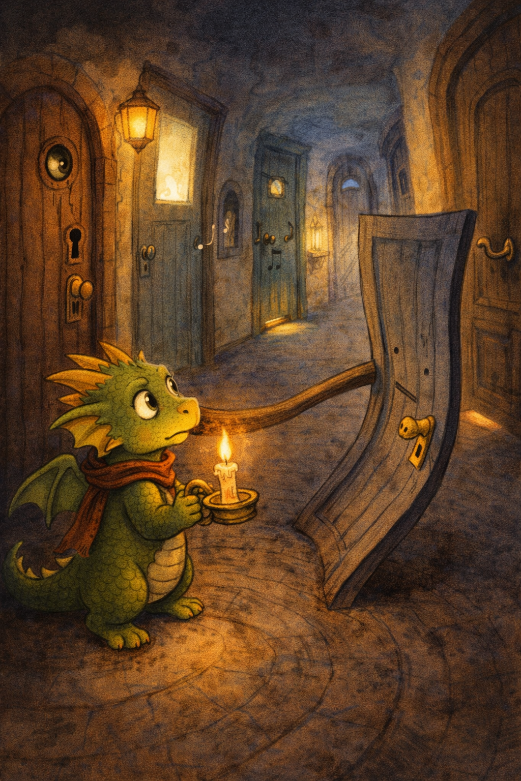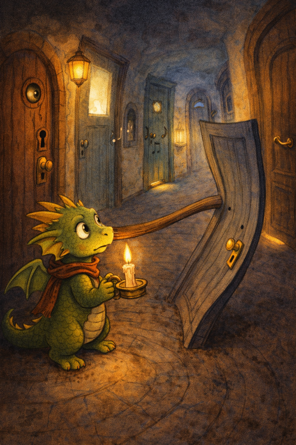 [RECOVERED PROMPT LOG]"A whimsical storybook illustration of a small dragon in a warm, enchanted hallway lined with mismatched magical doors. One curious door bends slightly or reaches out with a small wooden arm to gently knock on the dragon’s shoulder, surprising them. The dragon looks startled but intrigued, not frightened. Other doors show subtle signs of life: one peeks through a keyhole like an eye, one whistles softly, one glows under the crack, one has a handle turned like a smile. Cozy lamplight, dusky blue shadows, playful and slightly unsettling, child-friendly, Alice-in-Wonderland-like wonder, mischievous not scary."