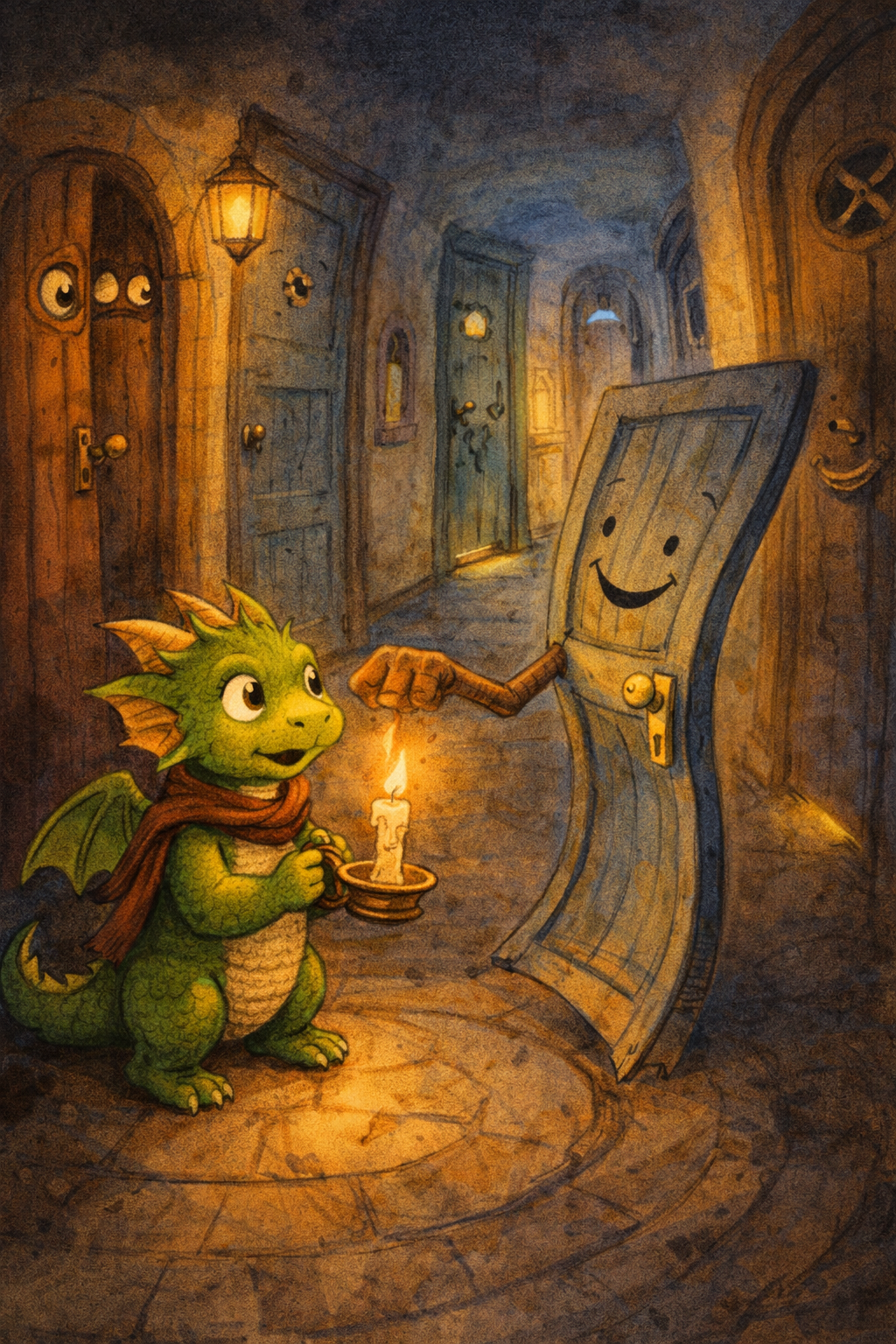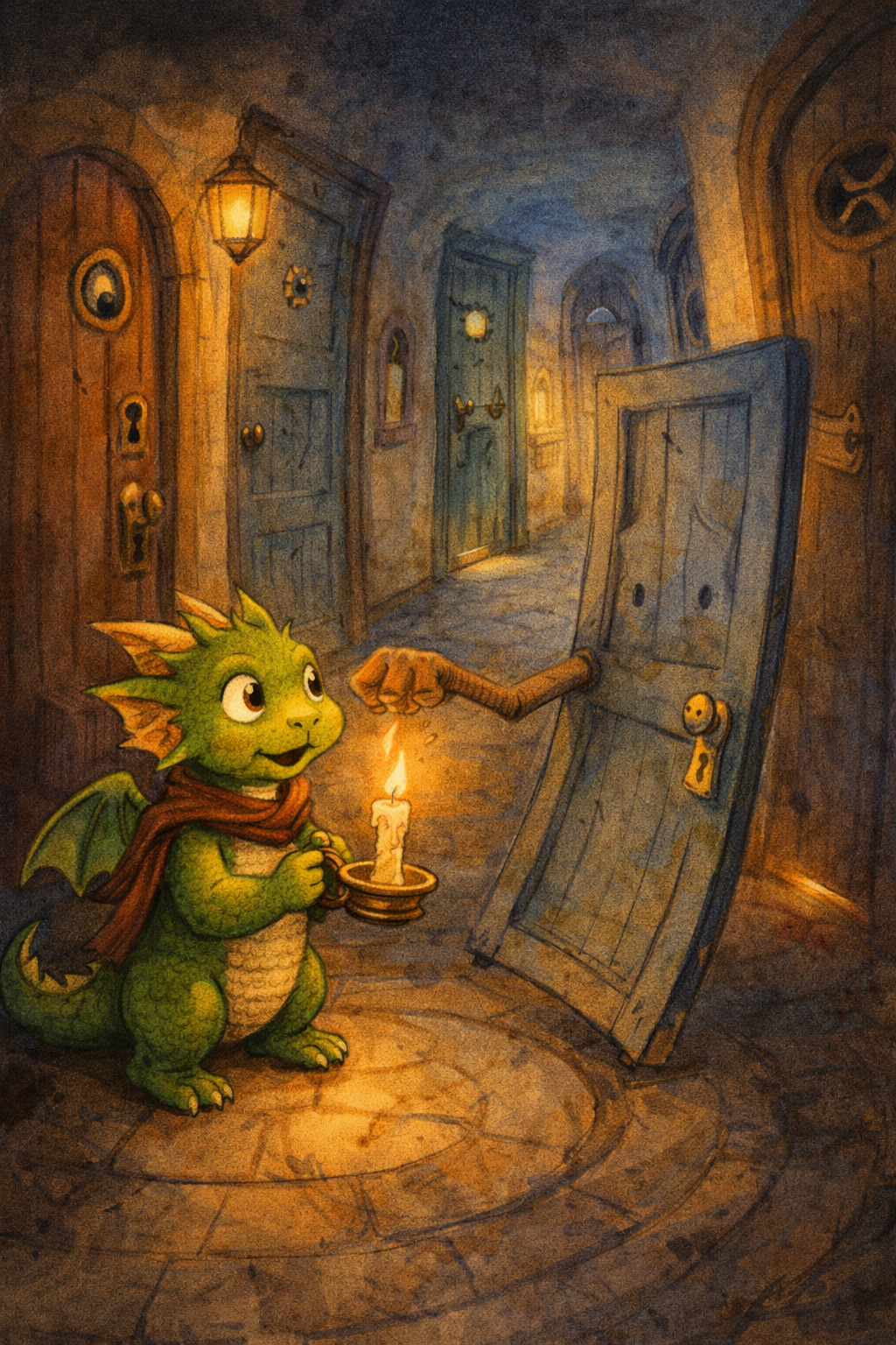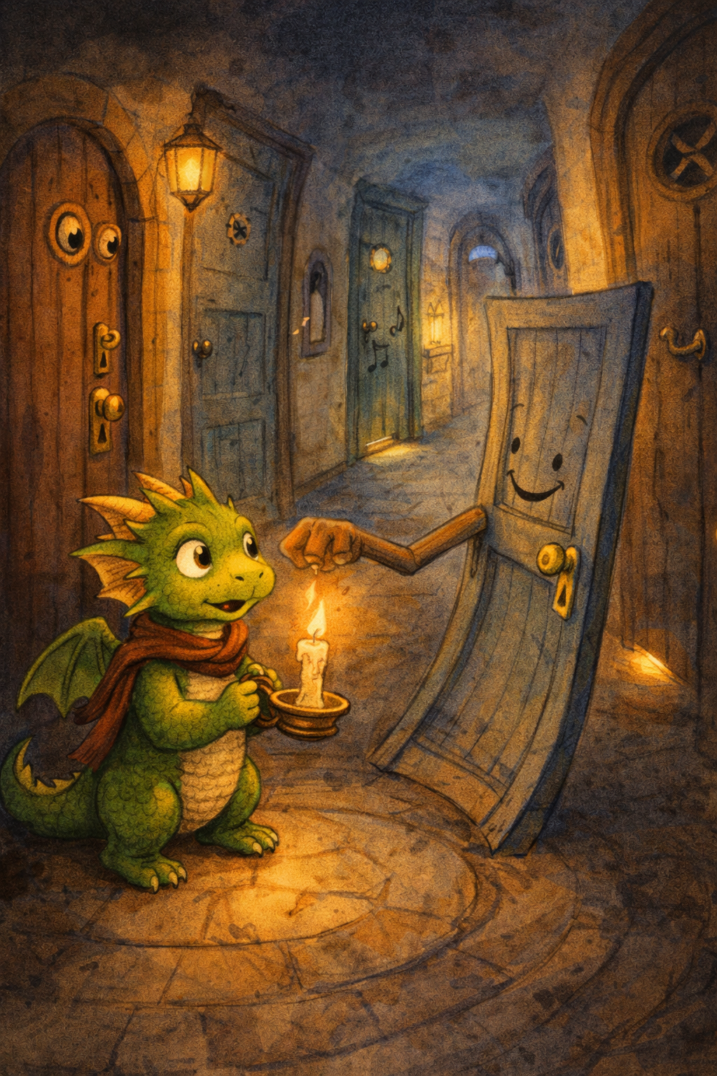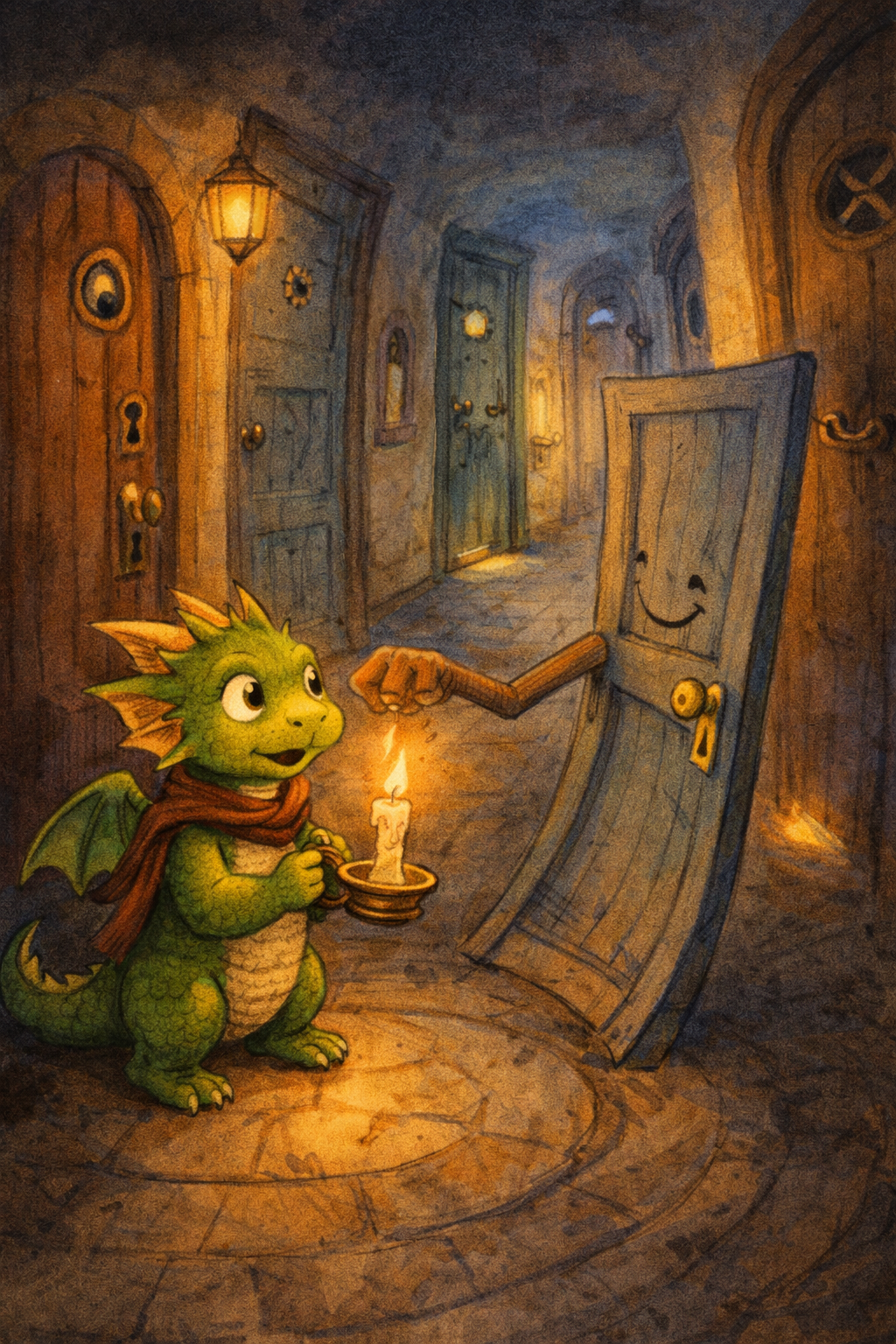 [RECOVERED PROMPT LOG]"A whimsical storybook illustration of a small dragon in a warm, enchanted hallway lined with mismatched magical doors. One curious door bends slightly or reaches out with a small wooden arm to gently knock on the dragon’s shoulder, surprising them. The dragon looks startled but intrigued, not frightened. Other doors show subtle signs of life: one peeks through a keyhole like an eye, one whistles softly, one glows under the crack, one has a handle turned like a smile. Cozy lamplight, dusky blue shadows, playful and slightly unsettling, child-friendly, Alice-in-Wonderland-like wonder, mischievous not scary."